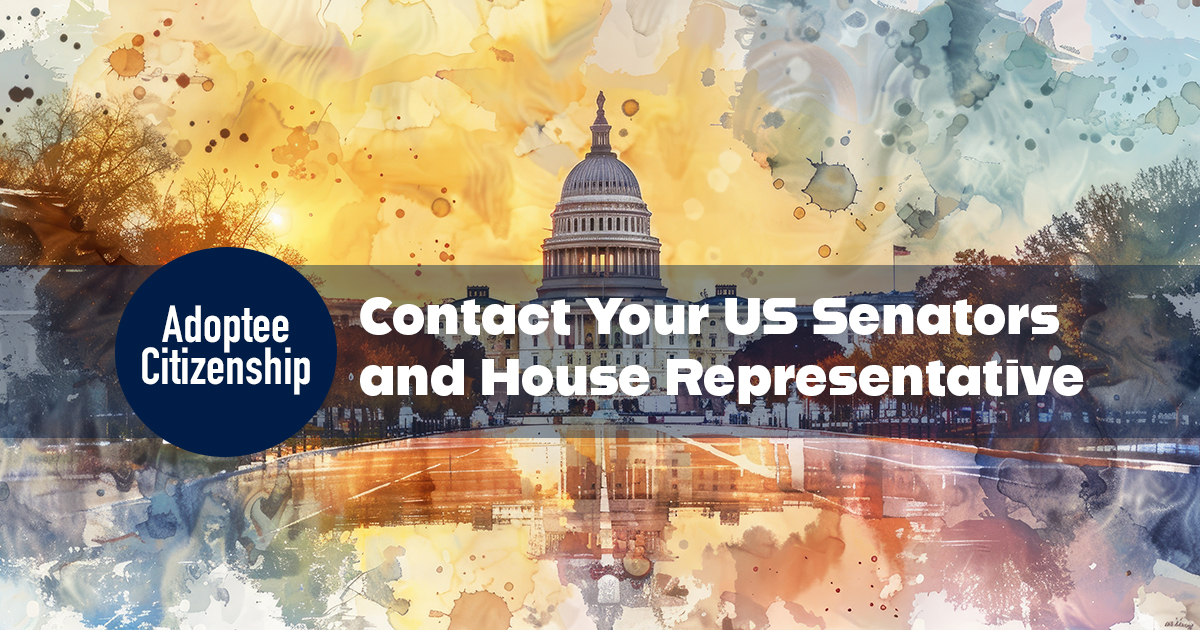 Watercolor painting of the US capitol building with words asking people to take action to contact their senators and House representative